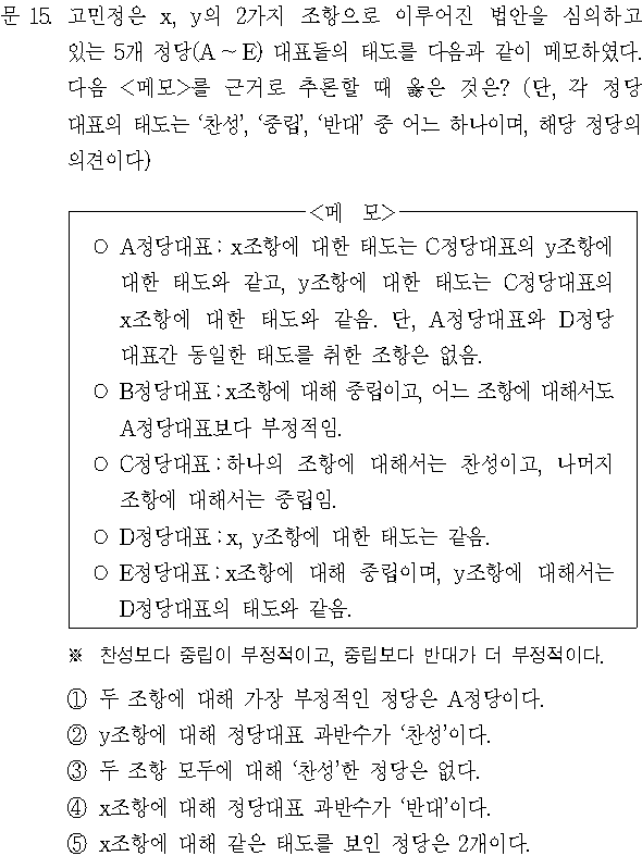D정당대표의 x,y 조항에 대한 태도는 같은데 A정당대표와 D정당대표 간 동일한 태도를 취한 조항은 없어야 하므로 D는 x, y에 모두 반대하였을 것이다.