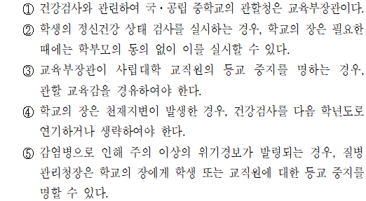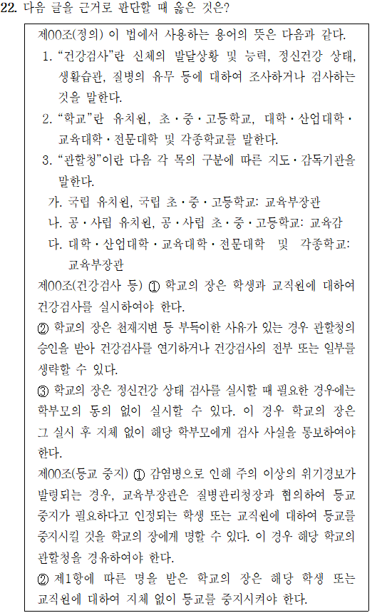 문제 해설▷ 정답 ②①. (X) 첫 번째 조 제3호) 국립 중학교의 관할청은 교육부장관이지만, 공립 중학교의 관할청은 교육감이다. ②. (O) 두 번째 조 제3항) 학교의 장은 학생의 정신건강 상