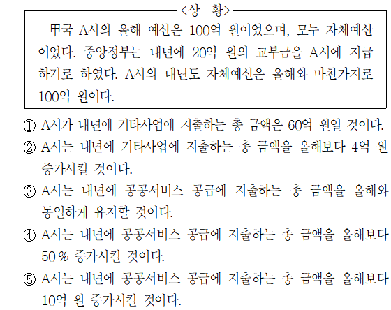 甲국 A시는 자체예산을 공공서비스와 기타사업에 항상 절반씩 투입하므로, 올해 예산 100억 원 중 공공서비스에 50억 원, 기타사업에 50억 원 투입한다.