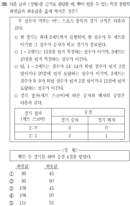 문제 해설▷ 정답 ③두 경기를 하여 승점 4점을 얻을 수 있는 상황으로 1) 승점 3점과 1점을 얻는 것과 2) 승점 2점씩 얻는 것이 있다. 각 상황별 승점의 최댓값과 최솟값을 구해보면 다음과
