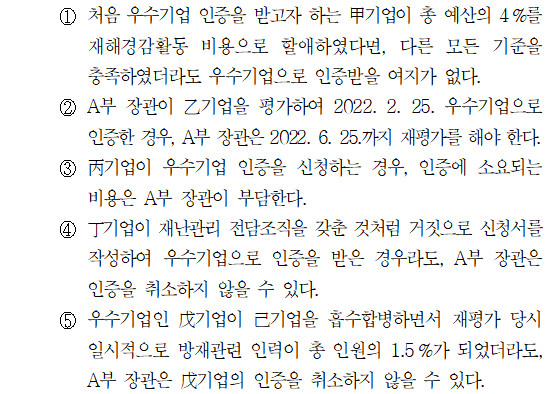 문제 해설▷ 정답 ⑤①. (X) 두 번째 조 2, 3항) 제2항에 따르면, 제3호에서 재해경감활동 비용으로 총 예산의 5% 이상 할애할 것을 우수기업 인증 시 평가기준으로 정하고 있다. 그러므로 甲기