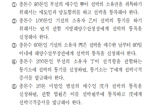 총톤수 60톤인 기선의 소유자 丙은 선박을 매수한 날부터 60일 이내에 해양수산부장관이 아닌 선적항을 관할하는 지방해양수산청장에게 선박의 등록을 신청해야 한다.
