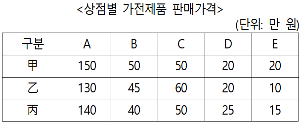 ○ 서연이는 가전제품 A~E를 1대씩 구매하기 위하여 상점 甲, 乙, 丙의 가전제품 판매가격을 알아보았다.![]() ○ 서연이는 각각의 가전제품을 세 상점 중 어느 곳에서나 구매할 수 있으며, 아래의 <혜택>을 이용하여 총 구매액을 최소화하고자 한다. <혜 택> - 甲: 200만 원 이상 구매시 전품목 10% 할인 - 乙: A를 구매한 고객에게는 C, D를 20% 할인 - 丙: C, D를 모두 구매한 고객에게는 E를 5만 원에 판매 |