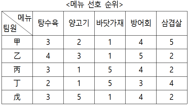 甲~戊로 구성된 A팀은 회식을 하고자 한다. 회식메뉴는 다음의 <메뉴 선호 순위>와 <메뉴 결정 기준>을 고려하여 정한다.![]() <메뉴 결정 기준> ○ 기준1: 1순위가 가장 많은 메뉴로 정한다. ○ 기준2: 5순위가 가장 적은 메뉴로 정한다. ○ 기준3: 1순위에 5점, 2순위에 4점, 3순위에 3점, 4순위에 2점, 5순위에 1점을 부여하여 각각 합산한 뒤, 점수가 가장 높은 메뉴로 정한다. ○ 기준4: 기준3에 따른 합산 점수의 상위 2개 메뉴 중, 1순위가 더 많은 메뉴로 정한다. ○ 기준5: 5순위가 가장 많은 메뉴를 제외하고 남은 메뉴 중, 1순위가 가장 많은 메뉴로 정한다. |