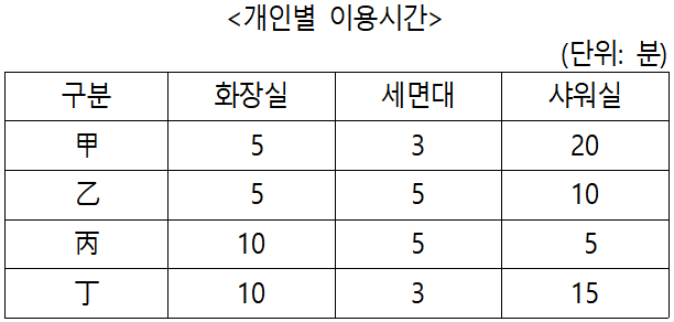 문제 다음 글을 근거로 판단할 때, 甲~丁 4명이 모두 외출 준비를 끝내는 데 소요되는 최소 시간은? 甲~丁 4명은 화장실 1개, 세면대 1개, 샤워실 2개를 갖춘 숙소에 묵었다. 다음날 아침 이들은