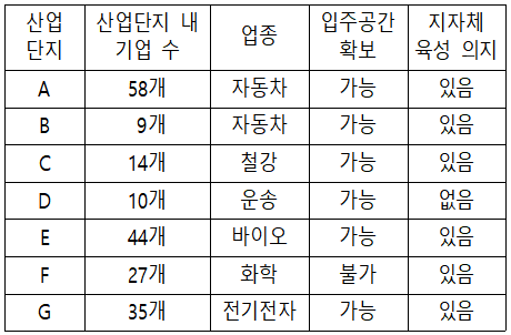 3곳을 선정할 경우 동점인 B와 G에 대해서 우선순위를 고려해야 한다. B의 산업클러스터 연관성 점수가 40점(자동차)으로 G의 20점보다 높으므로 B가 선정된다.