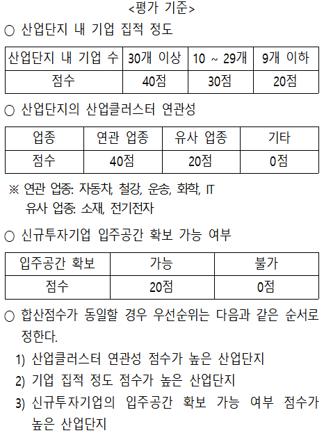 3곳을 선정할 경우 동점인 B와 G에 대해서 우선순위를 고려해야 한다. B의 산업클러스터 연관성 점수가 40점(자동차)으로 G의 20점보다 높으므로 B가 선정된다.