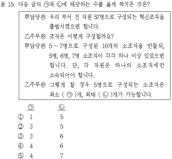 6명 또는 7명 소조직을 최대한으로 구성해 남은 직원 수를 5의 배수로 만들면 된다. 만약 6명 소조직을 4개 만들게 되면, 나머지 15명을 5명으로 구성되는 소조직으로 구성할 수 있다. 이때 5명으로 구성되는 소조직은 모두 4개가 된다. (처음에 빼두었던 1개를 더하는 것을 잊지 말 것!)