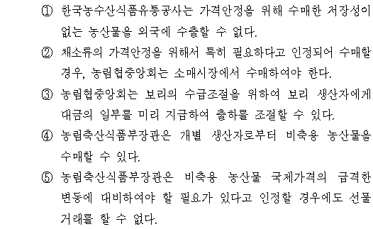 문제 다음 글을 근거로 판단할 때 옳은 것은? 제00조 ① 농림축산식품부장관은 채소류 등 저장성이 없는 농산물의 가격안정을 위하여 필요하다고 인정할 때에는 생산자 또는 생산자단체로부터