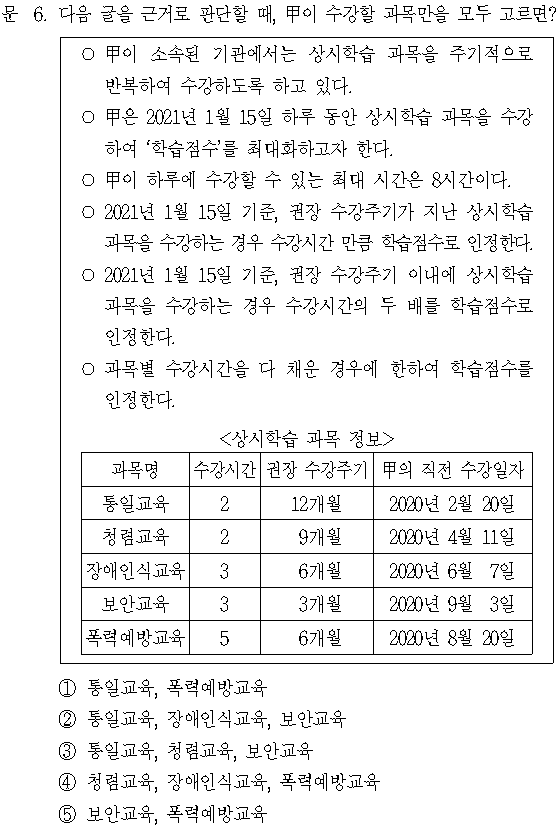 문제 다음 글을 근거로 판단할 때, 甲이 수강할 과목만을 모두 고르면? ○ 甲이 소속된 기관에서는 상시학습 과목을 주기적으로 반복하여 수강하도록 하고 있다. ○ 甲은 2021년 1월 15일 하루 동