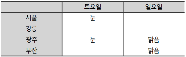 甲과 丁의 진술에 따라 지난 주말의 각 도시의 날씨를 추론하면 아래 표와 같다. (甲이 서울에 간 날짜를 토요일로 상정했다)