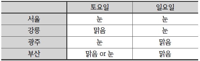 따라서 이 경우 부산은 양 일 모두 맑아야만 하고, 서울은 하루만 눈이 올 수도 있다.