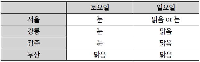 따라서 이 경우 서울은 양 일 모두 눈이 와야 하고, 부산은 하루만 눈이 올 수도 있다.