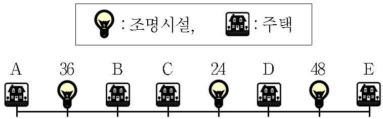 ○○나라는 주택에 도달하는 빛의 조도를 다음과 같이 예측한다.![]() 1. 각 조명시설에서 방출되는 광량은 그림에 표시된 값이다. 2. 위 그림에서 1칸의 거리는 2이며, 빛의 조도는 조명시설에서 방출되는 광량을 거리로 나눈 값이다. 3. 여러 조명시설로부터 동시에 빛이 도달할 경우, 각 조명시설로부터 주택에 도달한 빛의 조도를 예측하여 단순 합산한다. 4. 주택에 도달하는 빛은 그림에 표시된 세 개의 조명시설에서 방출되는 빛 외에는 없다고 가정한다. |