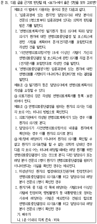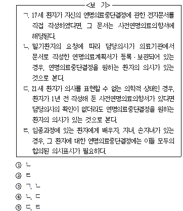 문제 다음 글을 근거로 판단할 때, <보기>에서 옳은 것만을 모두 고르면? 제00조 이 법에서 사용하는 용어의 뜻은 다음과 같다. 1. ‘임종과정에 있는 환자’란 담당의사와 해당 분야의 전문의 1명