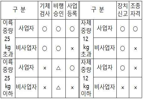 | <드론 비행 안전 규칙> 드론을 비행하려면 다음 요건을 갖추어야 한다. ![]() ※ ○: 필요, ×: 불필요, △: 공항 또는 비행장 중심 반경 5km 이내에서는 필요 |