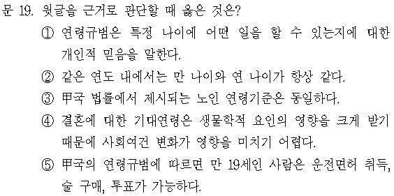 문제 ※ 다음 글을 읽고 물음에 답하시오. 연령규범은 특정 연령의 사람이 어떤 일을 할 수 있거나 해야 한다는 사회적 기대와 믿음이다. 연령규범은 사회적 자원 분배나 사회문화적 특성, 인간
