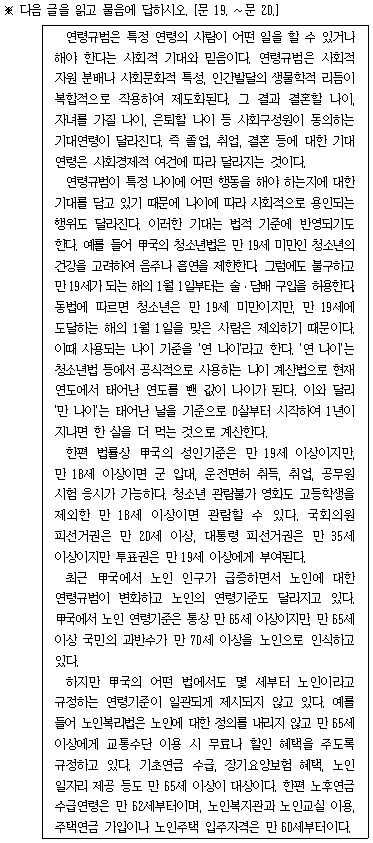 문제 ※ 다음 글을 읽고 물음에 답하시오. 연령규범은 특정 연령의 사람이 어떤 일을 할 수 있거나 해야 한다는 사회적 기대와 믿음이다. 연령규범은 사회적 자원 분배나 사회문화적 특성, 인간
