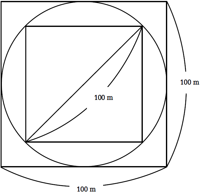 | 甲은 죽기 전 자신이 가진 가로와 세로가 각각 100m인 정사각형의 땅을 다음과 같이 나누어 주겠다는 유서를 작성하였다. “내 전 재산인 정사각형의 땅에 내접하는 원을 그리고, 다시 그 원에 내접하는 정사각형을 그린다. 그 내접하는 정사각형에 해당하는 땅을 첫째 딸에게 주고, 나머지 부분은 둘째 딸에게 물려준다.” |
