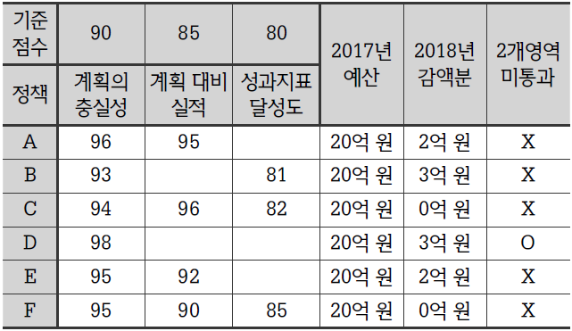 ○ 甲부서에서는 2018년도 예산을 편성하기 위해 2017년에 시행되었던 정책(A∼F)에 대한 평가를 실시하여, 아래와 같은 결과를 얻었다.