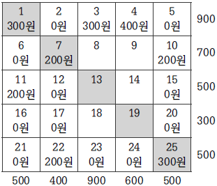 | ○ 아래와 같이 생긴 25개의 사물함 각각에는 200원이 들어 있거나 300원이 들어 있거나 돈이 아예 들어있지 않다. ○ 그림의 우측과 아래에 쓰인 숫자는 그 줄의 사물함에 든 돈의 액수를 모두 합한 금액이다. 예를 들어, 1번, 2번, 3번, 4번, 5번 사물함에 든 돈의 액수를 모두 합하면 900원이다. ○ 11번 사물함에는 200원이 들어 있고, 25번 사물함에는 300원이 들어 있으며, 전체 사물함 중 200원이 든 사물함은 4개뿐이다. ![]()  |