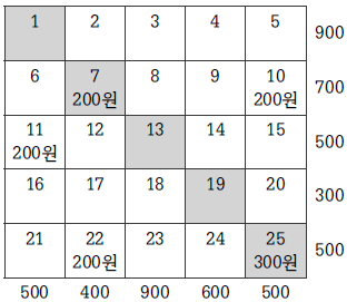 | ○ 아래와 같이 생긴 25개의 사물함 각각에는 200원이 들어 있거나 300원이 들어 있거나 돈이 아예 들어있지 않다. ○ 그림의 우측과 아래에 쓰인 숫자는 그 줄의 사물함에 든 돈의 액수를 모두 합한 금액이다. 예를 들어, 1번, 2번, 3번, 4번, 5번 사물함에 든 돈의 액수를 모두 합하면 900원이다. ○ 11번 사물함에는 200원이 들어 있고, 25번 사물함에는 300원이 들어 있으며, 전체 사물함 중 200원이 든 사물함은 4개뿐이다. ![]() |