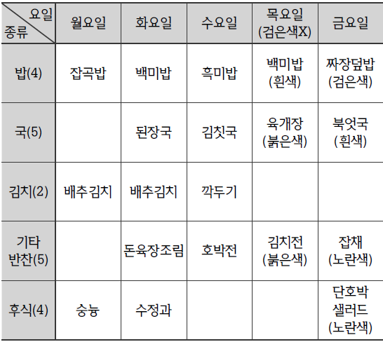 ○ 한 끼의 식사는 밥, 국, 김치, 기타 반찬, 후식 각 종류별로 하나의 음식을 포함하며, 요일마다 다양한 색의 음식으로 이번 주의 점심식단을 짜고자 한다.