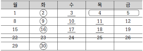 날짜가 등장한다고 해서 모두 달력을 그려야 하는 문제는 아니다. 앞서 살펴본 1번 문제의 경우 달력을 그리지 않아도 어렵지 않게 해결할 수 있었다. 그러나 이 문제의 경우 각 선지들이 4월 한 달간 각 교육의 배치를 날짜별로 전반적으로 알아야만 풀어갈 수 있도록 구성되어 있다. 따라서 이 경우 간략하게 달력을 그려 문제를 푸는 것을 고려해볼 수 있다.