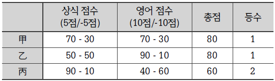 선지에 따라 틀린 개수에 부여하는 점수를 바꿔서 상식 과목의 틀린 개수에–5점, 영어 과목의 틀린 개수에–10점을 부여하여 총점을 계산한다. 총점을 계산하면 甲과 乙이 80점으로 공동 1등, 丙이 60점으로 2등이 된다.