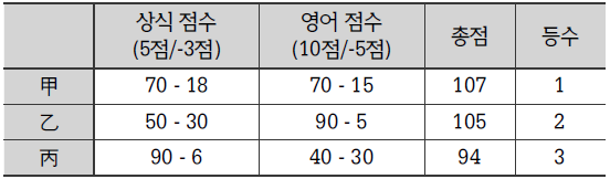 B방식의 경우, 우선 A방식처럼 상식 과목의 맞은 개수에 5점, 영어 과목의 맞은 개수에 10점을 부여한다. 그리고 나서 상식 과목의 틀린 개수에–3점, 영어 과목의 틀린 개수에–5점을 부여하여 총점을 계산한다. 총점을 계산하면 甲이 107점으로 1등, 乙이 105점으로 2등, 丙이 94점으로 3등이 된다.