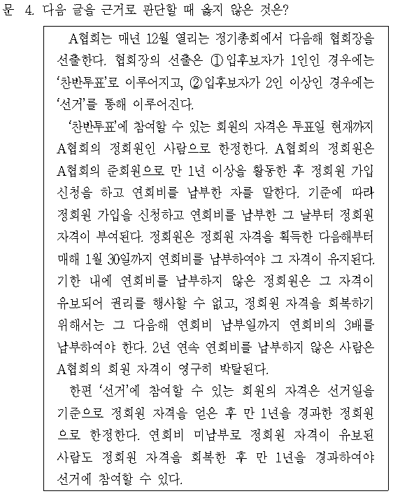 연회비 미납부로 정회원 자격이 유보된 사람도 정회원 자격을 회복한 후 만 1년을 경과하여야 선거에 참여할 수 있다. 丙이 2019년에 정회원 자격을 회복하였다면, 만 1년을 경과하여야 선거에 참여할 수 있는 만큼 2019년 12월에 열리는 ‘2020년 협회장’ 선출을 위한 ‘선거’에 참여할 수 없었을 것이다.