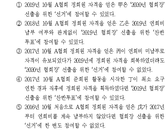 ‘2019년 협회장’ 선출을 위한 ‘찬반투표’는 2018년 12월에 치러지며, ‘찬반투표’에 참여할 수 있는 회원의 자격은 투표일 현재까지 A협회의 정회원인 사람으로 한정된다. 그리고 정회원이 되기 위해서는 A협회의 준회원으로 만 1년 이상을 활동한 후 정회원 가입 신청을 하고 연회비를 납부해야 한다. 2018년 10월 A협회 정회원 자격을 얻은 乙은 2019년 1월 31일까지 2019년 연회비를 납부해야 하므로 2019년 연회비 납부 여부와 관계없이 ‘2019년 협회장’ 선출을 위한 ‘찬반투표’에 참여할 수 있었다. (정회원 자격을 얻었다는 점에서 이미 2018년 연회비는 납부했다는 것을 알 수 있음)
