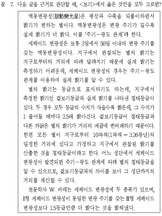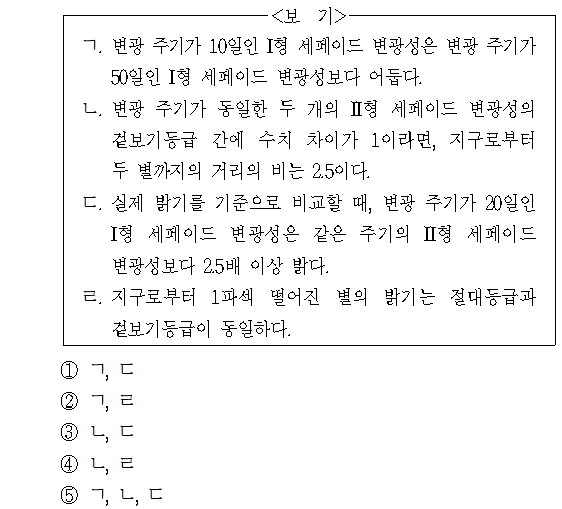 다른 모든 조건이 동일할 때, 겉보기등급의 수치 차이가 1이라면 두 별의 밝기 차이가 2.5배이고 별의 밝기는 거리의 ‘제곱’에 반비례하므로 지구로부터 두 별까지의 거리의 비는 2.5가 아니다.