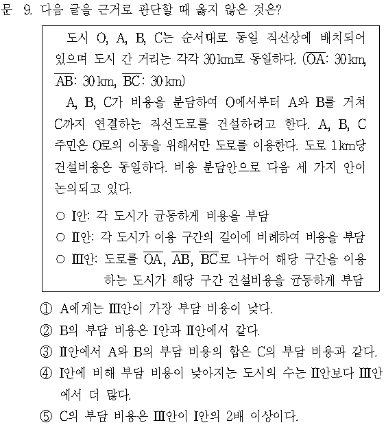 ④. (O) Ⅰ안에 비해 부담 비용이 낮아지는 도시의 수는 Ⅱ안의 경우 1개(A)이고, Ⅲ안의 경우 2개(A, B)이다.