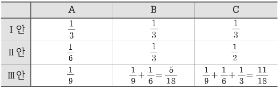 ⑤. (X) Ⅰ안일 때 C의 부담 비용의 2배는 2/3=12/18 이므로 Ⅲ안일 때 C의 부담 비용인 11/18 은 2배 미만이다.