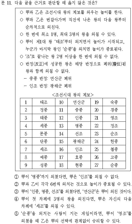 문제 다음 글을 근거로 판단할 때 옳지 않은 것은? ○ 甲과 乙은 조선시대 왕의 계보를 외우는 놀이를 한다. ○ 甲과 乙은 번갈아가며 직전에 나온 왕의 다음 왕부터 순차적으로 외친다. ○ 한 번
