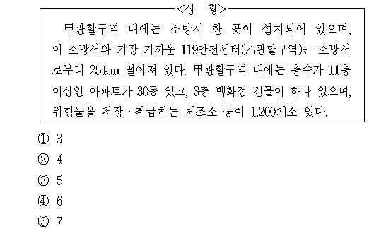 하지만 층수가 5층 이상인 아파트가 50동 이상 있거나 5층 이상 백화점, 복합상영관 등 대형 화재의 우려가 있는 건물은 없으므로 굴절사다리차는 배치하지 않아도 된다(가.의 2) 항목).