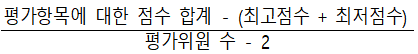평가항목별 최종점수는 최고점수와 최저점수를 제외한 나머지 두 평가위원이 부여한 점수의 평균이다.