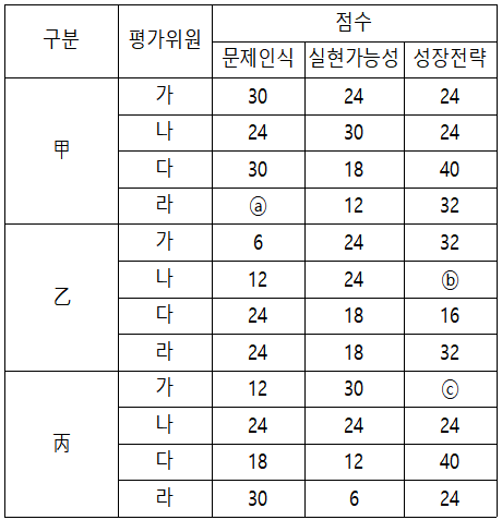 따라서 ⓑ=ⓒ > 16이라면, 성장전략 평가항목의 최종점수는 乙이 丙보다 크거나 같으므로 낮지 않다.