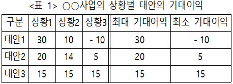 | 기준Ⅰ, 기준Ⅱ, 기준Ⅲ을 이용하여 불확실한 상황에서 대안을 비교․평가할 수 있다. 기준Ⅰ은 최상의 상황이 발생할 것이라는 가정에서 최선의 대안을 선택하는 것이다. <표 1>에서 각 대안의 최대 기대이익을 비교하여, 그 중 가장 큰 값을 갖는 ‘대안1’을 선택하는 것이다. 기준Ⅱ는 최악의 상황이 발생할 것이라는 가정에서 최선의 대안을 선택하는 것이다. <표 1>에서 각 대안의 최소 기대이익을 비교하여, 그 중 가장 큰 값을 갖는 ‘대안3’을 선택하는 것이다. ![]() 기준Ⅲ은 최대 ‘후회’가 가장 작은 대안을 선택하는 것이다. 후회는 일정한 상황에서 특정 대안을 선택함으로써 최선의 대안을 선택하였더라면 얻을 수 있는 기대이익을 얻지 못해 발생하는 손실을 의미한다. <표 1>의 상황별 최대 기대이익에서 각 대안의 기대이익을 차감하여 <표 2>와 같이 후회를 구할 수 있다. 이후 각 대안의 최대 후회를 비교하여, 그 중 가장 작은 값을 갖는 ‘대안2’를 선택하는 것이다. ![]() |