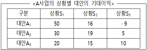 | 기준Ⅰ, 기준Ⅱ, 기준Ⅲ을 이용하여 불확실한 상황에서 대안을 비교․평가할 수 있다. 기준Ⅰ은 최상의 상황이 발생할 것이라는 가정에서 최선의 대안을 선택하는 것이다. <표 1>에서 각 대안의 최대 기대이익을 비교하여, 그 중 가장 큰 값을 갖는 ‘대안1’을 선택하는 것이다. 기준Ⅱ는 최악의 상황이 발생할 것이라는 가정에서 최선의 대안을 선택하는 것이다. <표 1>에서 각 대안의 최소 기대이익을 비교하여, 그 중 가장 큰 값을 갖는 ‘대안3’을 선택하는 것이다. ![]() 기준Ⅲ은 최대 ‘후회’가 가장 작은 대안을 선택하는 것이다. 후회는 일정한 상황에서 특정 대안을 선택함으로써 최선의 대안을 선택하였더라면 얻을 수 있는 기대이익을 얻지 못해 발생하는 손실을 의미한다. <표 1>의 상황별 최대 기대이익에서 각 대안의 기대이익을 차감하여 <표 2>와 같이 후회를 구할 수 있다. 이후 각 대안의 최대 후회를 비교하여, 그 중 가장 작은 값을 갖는 ‘대안2’를 선택하는 것이다. ![]() |