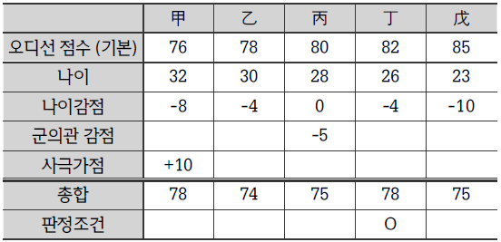 위의 세 조건을 반영하면 甲과 丙의 총합이 78점으로 동점이 된다. 따라서 최종 점수가 가장 높은 사람이 여럿인 경우, 그중 기본 점수가 가장 높은 한 사람을 캐스팅하므로 오디션점수(기본점수)가 높은 丁이 드라마에 캐스팅된다.