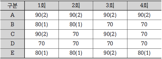 □□학과는 지망자 5명(A~E) 중 한 명을 교환학생으로 추천하기 위하여 각각 5회의 평가를 실시하고, 그 결과에 바탕을 둔 추첨을 하기로 했다. 평가 및 추첨 방식과 현재까지 진행된 평가 결과는 아래와 같다.