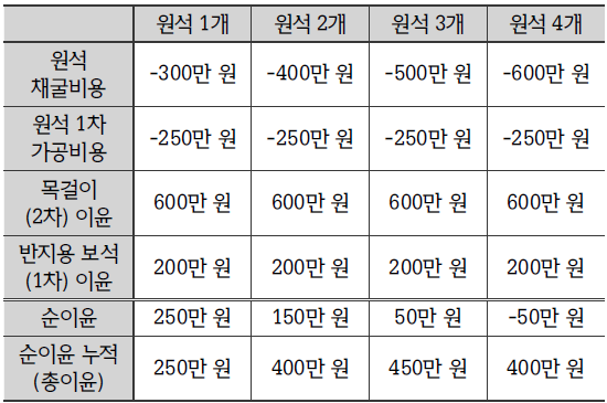 따라서 1차 가공 후 반지용 보석의 순이윤은 40개 × 5만 원 = 200만 원이다.