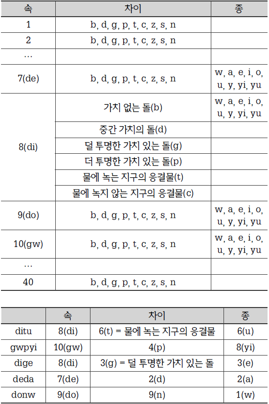 di는 8번째 속이므로 돌에 해당한다. t는 다섯 번째 차이에 해당한다. u는 여섯 번째 종에 해당한다. 8번째 속인 돌의 다섯 번째 차이는 물에 녹는 지구의 응결물에 해당한다. 따라서 ditu는 물에 녹는 지구의 응결물의 여섯 번째 종이다.