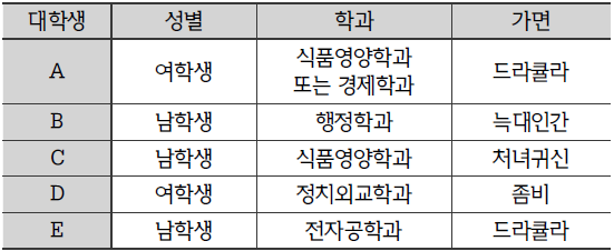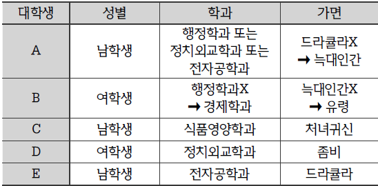 | 대학생 5명(A~E)이 모여 주말에 가면파티를 하기로 했다. ○ 남학생이 3명이고 여학생이 2명이다. ○ 5명은 각각 행정학과, 경제학과, 식품영양학과, 정치외교학과, 전자공학과 재학생이다. ○ 5명은 각각 늑대인간, 유령, 처녀귀신, 좀비, 드라큘라 가면을 쓸 것이다. ○ 본인의 성별, 학과, 가면에 대해 한 명은 모두 거짓만을 말하고 있고 나머지는 모두 진실만을 말하고 있다. |