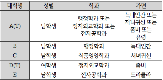 | 대학생 5명(A~E)이 모여 주말에 가면파티를 하기로 했다. ○ 남학생이 3명이고 여학생이 2명이다. ○ 5명은 각각 행정학과, 경제학과, 식품영양학과, 정치외교학과, 전자공학과 재학생이다. ○ 5명은 각각 늑대인간, 유령, 처녀귀신, 좀비, 드라큘라 가면을 쓸 것이다. ○ 본인의 성별, 학과, 가면에 대해 한 명은 모두 거짓만을 말하고 있고 나머지는 모두 진실만을 말하고 있다. |