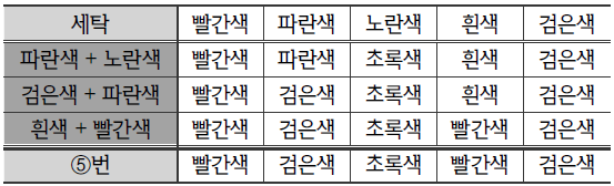 | ○ 수호는 현재 빨간색, 파란색, 노란색, 흰색, 검은색 수건을 각 1개씩 가지고 있다. ○ 수호는 본인의 세탁기로 세탁하며, 동일한 수건을 여러 번 세탁할 수 있다. ○ 수호가 가지고 있는 세탁기는 수건을 2개까지 동시에 세탁할 수 있고, 다른 색의 수건을 함께 세탁하면 다음과 같이 색이 변한다. - 빨간색 수건과 파란색 수건을 함께 세탁하면, 모두 보라색 수건이 된다. - 빨간색 수건과 노란색 수건을 함께 세탁하면, 각각 빨간색 수건과 주황색 수건이 된다. - 파란색 수건과 노란색 수건을 함께 세탁하면, 각각 파란색 수건과 초록색 수건이 된다. - 흰색 수건을 다른 색 수건과 함께 세탁하면, 모두 그 다른 색 수건이 된다. - 검은색 수건을 다른 색 수건과 함께 세탁하면, 모두 검은색 수건이 된다. |