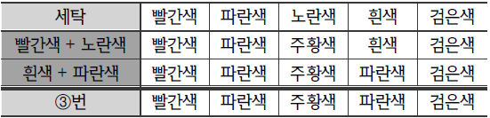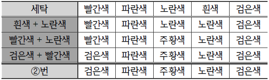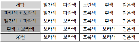 | ○ 수호는 현재 빨간색, 파란색, 노란색, 흰색, 검은색 수건을 각 1개씩 가지고 있다. ○ 수호는 본인의 세탁기로 세탁하며, 동일한 수건을 여러 번 세탁할 수 있다. ○ 수호가 가지고 있는 세탁기는 수건을 2개까지 동시에 세탁할 수 있고, 다른 색의 수건을 함께 세탁하면 다음과 같이 색이 변한다. - 빨간색 수건과 파란색 수건을 함께 세탁하면, 모두 보라색 수건이 된다. - 빨간색 수건과 노란색 수건을 함께 세탁하면, 각각 빨간색 수건과 주황색 수건이 된다. - 파란색 수건과 노란색 수건을 함께 세탁하면, 각각 파란색 수건과 초록색 수건이 된다. - 흰색 수건을 다른 색 수건과 함께 세탁하면, 모두 그 다른 색 수건이 된다. - 검은색 수건을 다른 색 수건과 함께 세탁하면, 모두 검은색 수건이 된다. |
