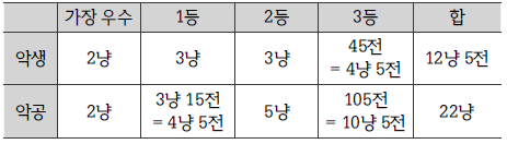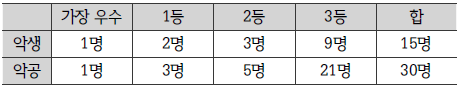 상금을 받는 악공의 수는 30명이고 상금을 받는 악생의 수는 15명이므로 악공 수가 악생 수의 2배이다.